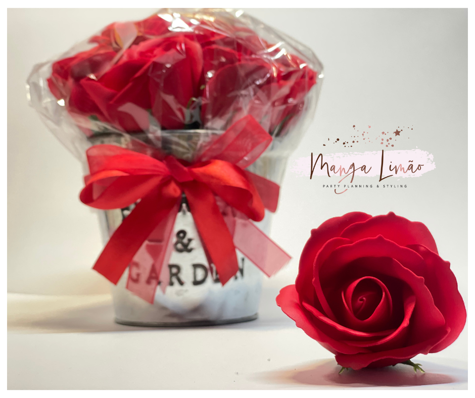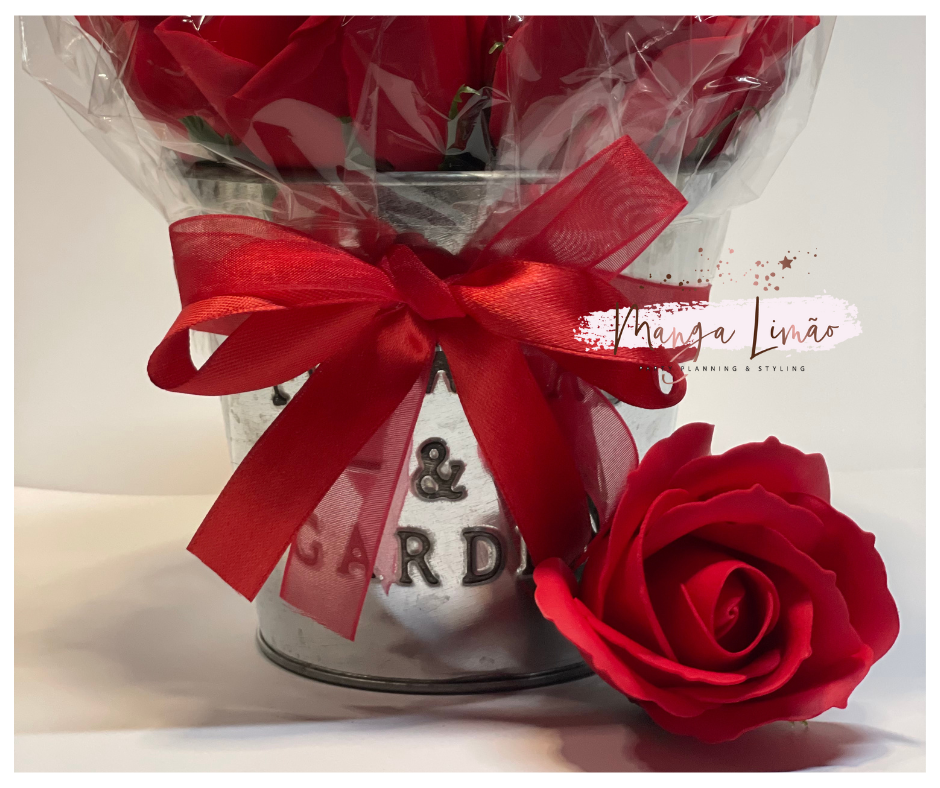 Balde em metal com rosas de sabão. Cheirosas e úteis não há quem resista a estas rosas.