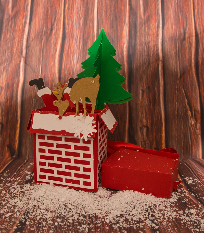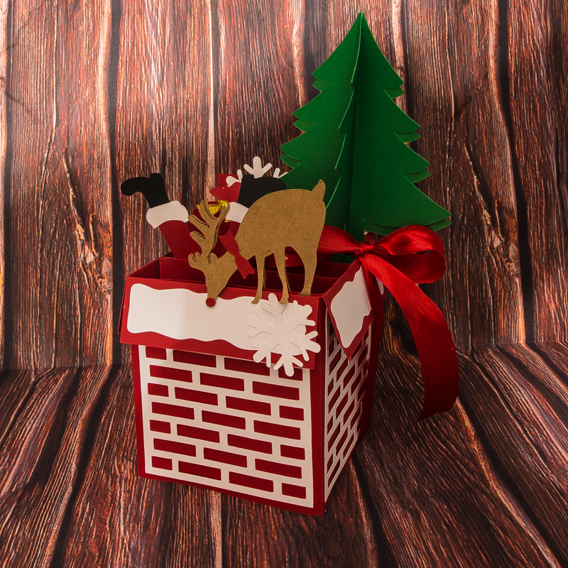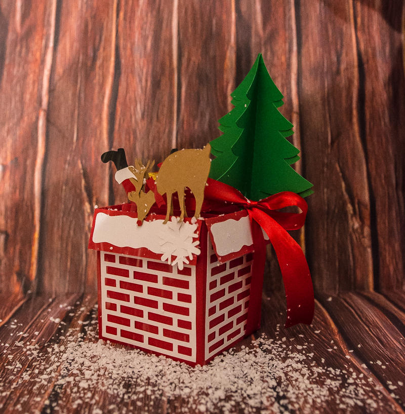 Este Original postal 3D vem com uma Caixa pensada para 4 bombons, que prende á chaminé com um laço de cetim vermelho. Atrás colocamos-lhe um envelope com um cartão 10x10 cm para a sua mensagem.