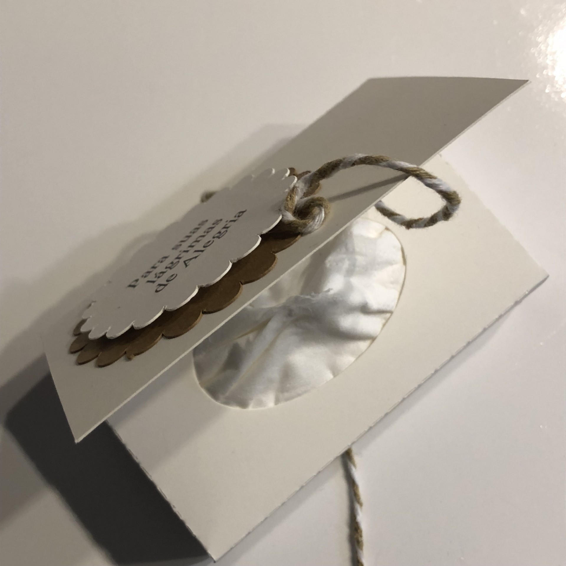 Base da caixa branca, com roseta colorida e roseta branca onde é escrita a mensagem. Entregue com lenços de papel.