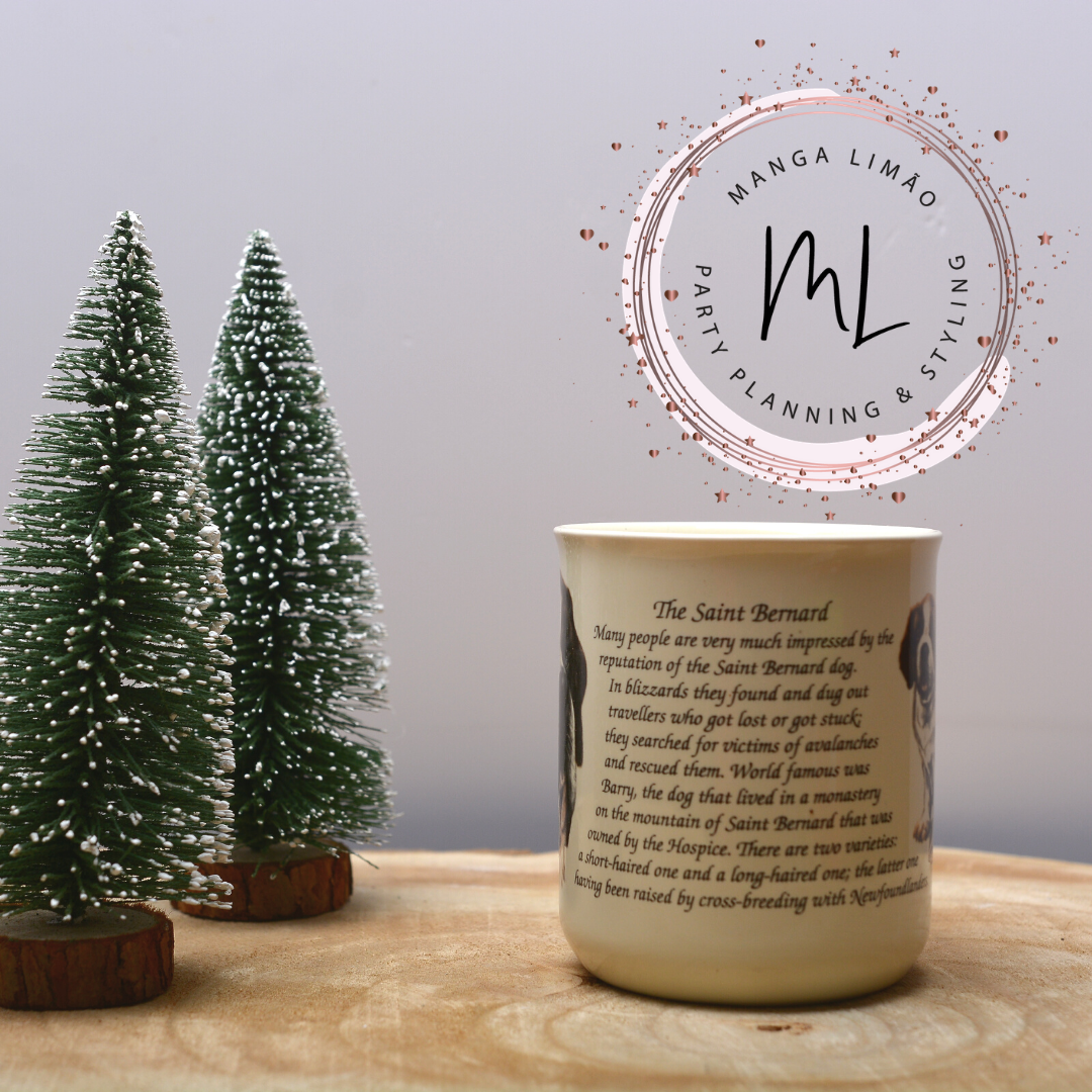 Caneca com São Bernardo. Esta caneca te a particularuidade de ter imagens da raça em cachorro, a história da raça ( em Inglês ) e a imagem da raça em adulto.