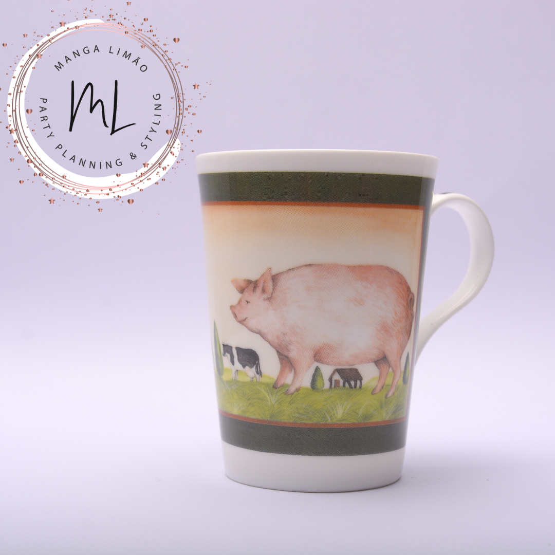 Canecas em porcelana com os animais da quinta. O porco, a vaca e o ganso são os aniamis reresentados nestas canecas.