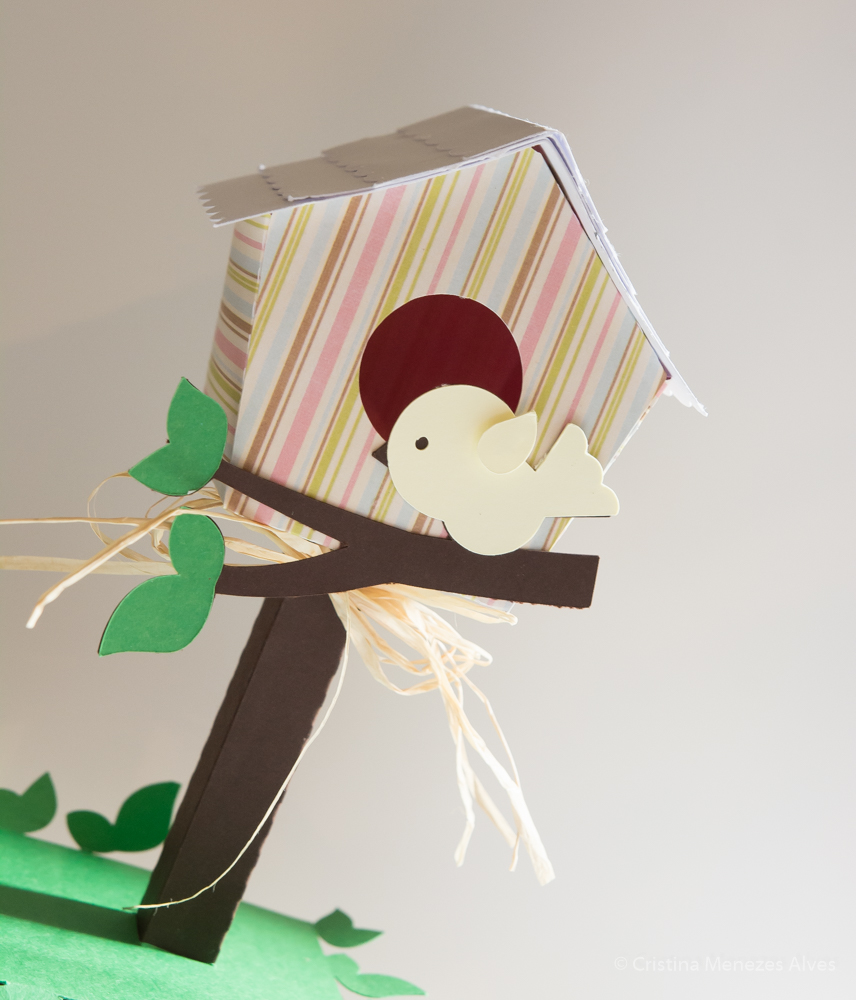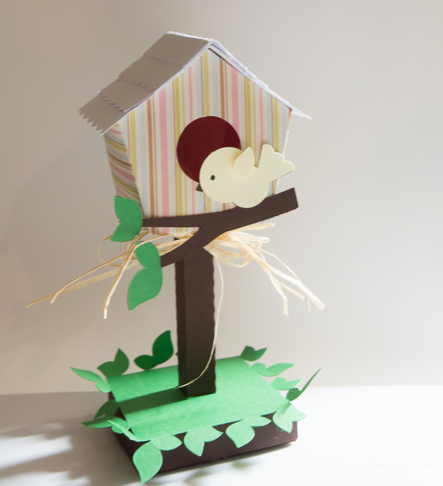 Casa de passarinho 3D, feita em cartolinas 250/ 280 gramas.