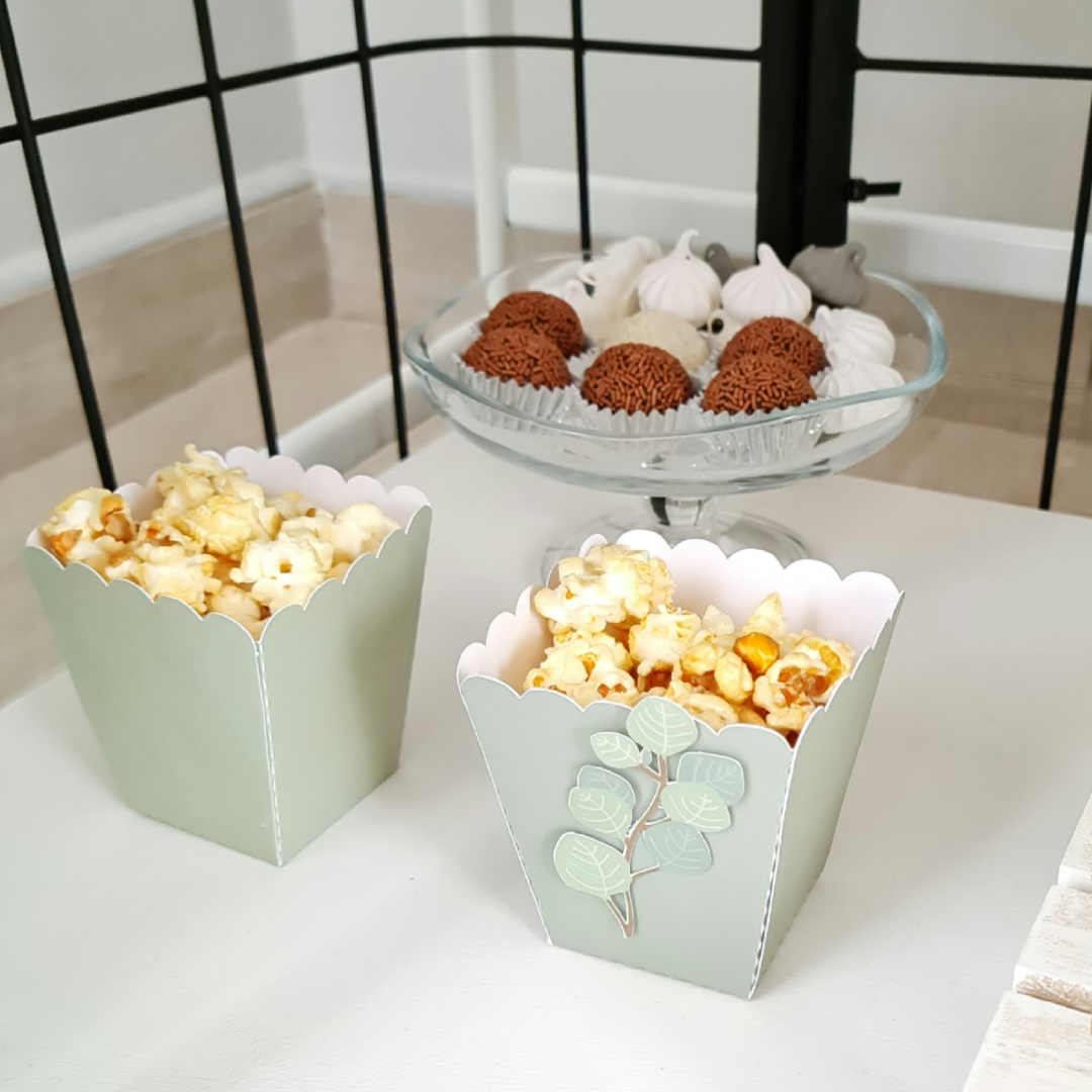 Copos de pipocas com efeito 2 dimensões. Estes copos são enviados com 2 modelos diferentes. 3 com folhas e 3 lisos.