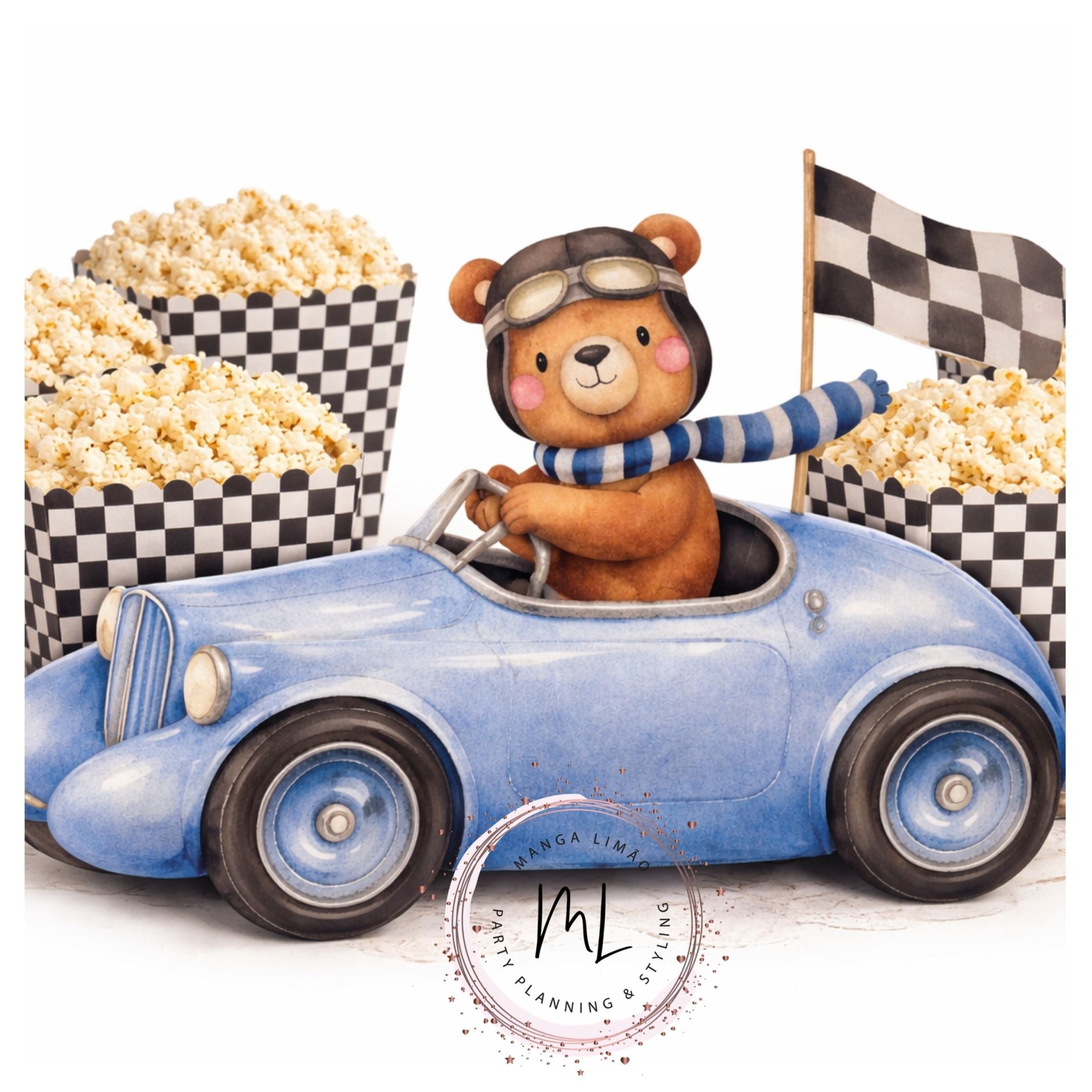 Decoração Festa Urso Oliver 🧸🏁 | Carro Ursinho + 6 Caixas de Pipocas Tema Corrida