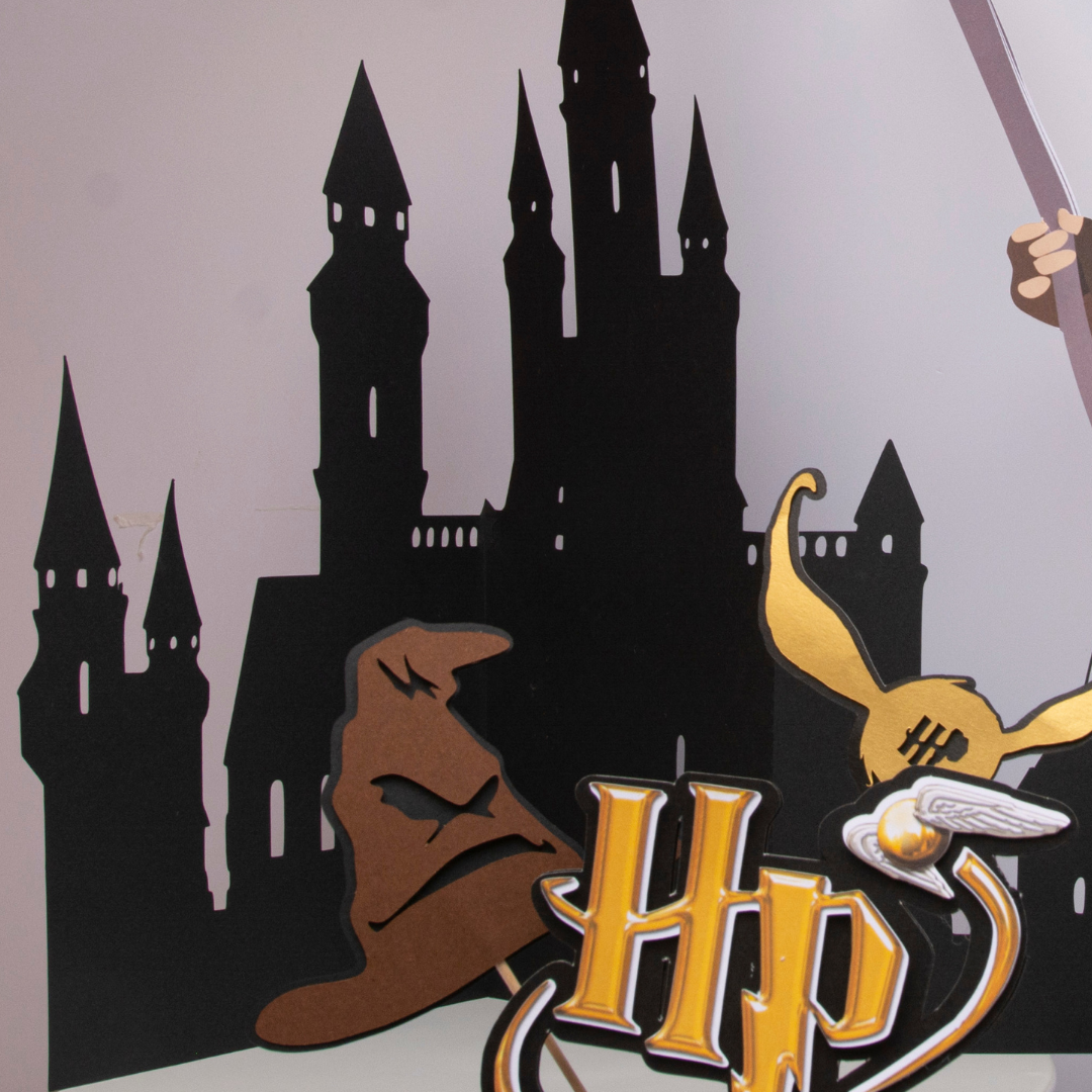 Várias decorações em papel com o tema Harry Potter