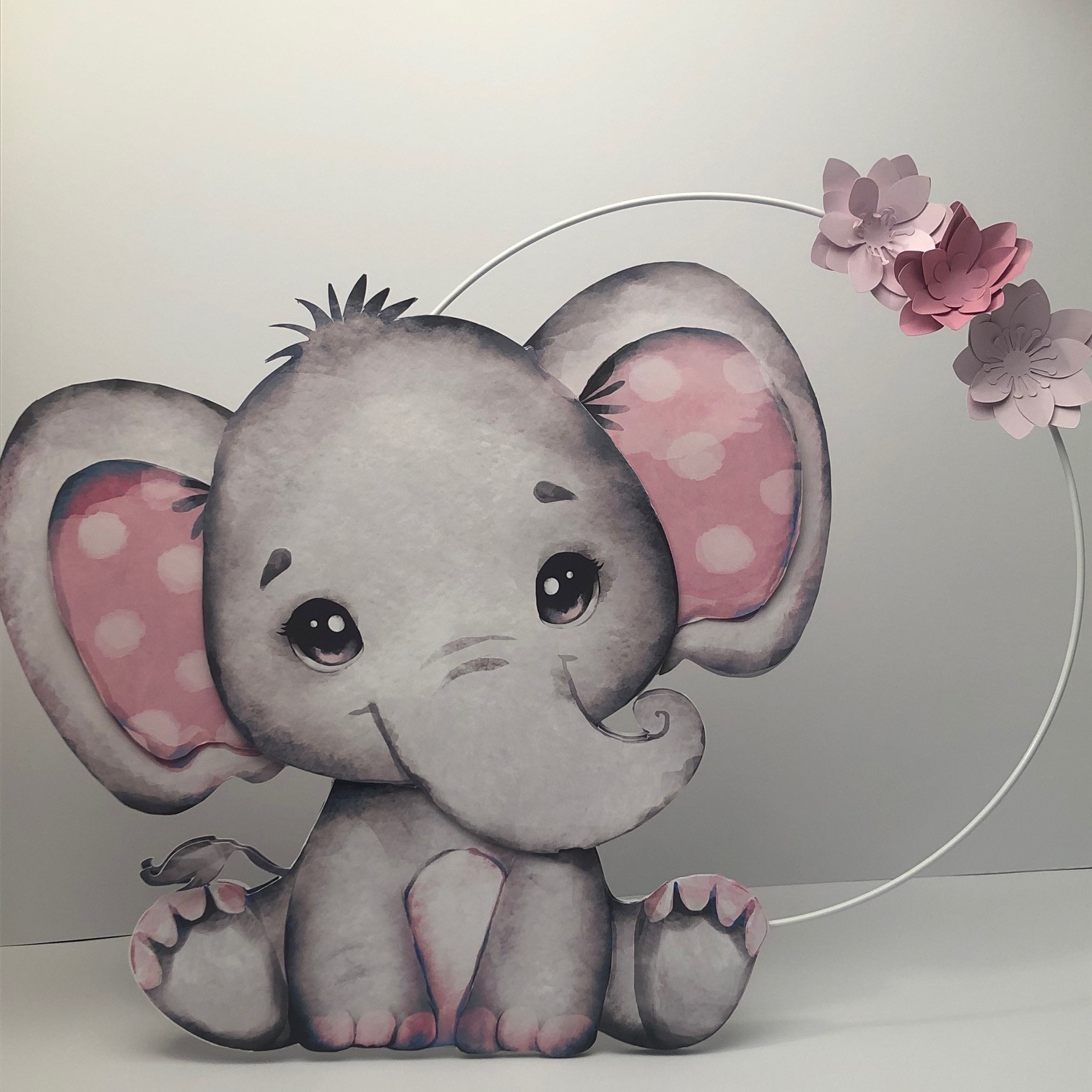 Elefante com cerca de 30 cm de altura, com aro e flores. Ideal para colocar na mesa ou pendurar na parede.