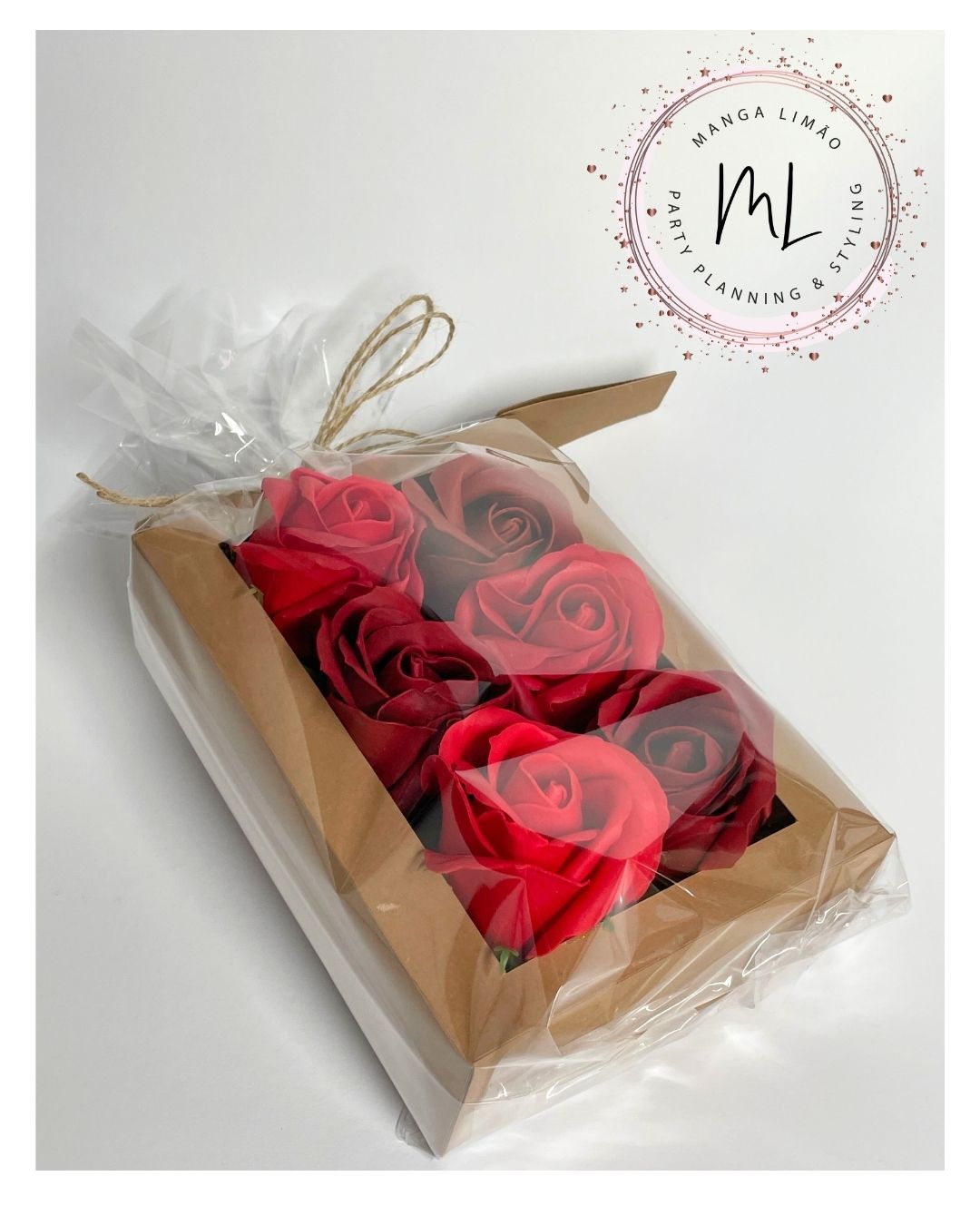 Esta embalagem elegante (aprox. 11x14 cm) contém 6 botões de rosas de sabão, realistas e perfumadas, ideais para oferecer como lembrança original em casamentos, batizados, eventos corporativos ou datas especiais.