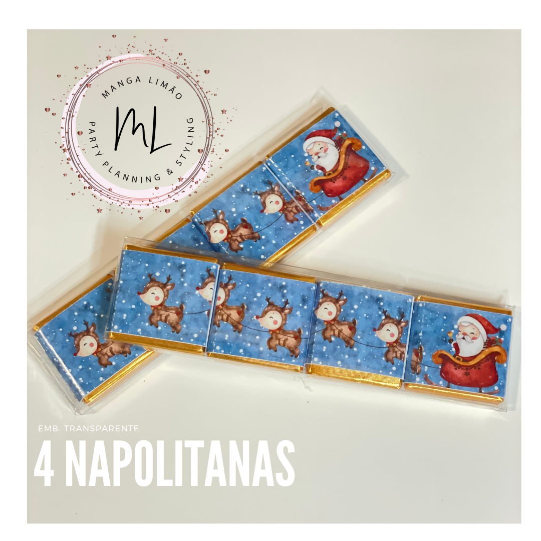 Esta encantadora embalagem com o desenho do Pai Natal no seu trenó contém 4 deliciosas napolitanas de chocolate de leite, cada uma com 3 gramas. Feitas na União Europeia com ingredientes de alta qualidade, estas napolitanas são o presente ideal para a época festiva. Perfeitas para encher as meias de Natal, oferecer em troca de amigo secreto ou simplesmente para saborear em momentos especiais. Surpreenda amigos e familiares com o sabor cremoso e irresistível do chocolate europeu!