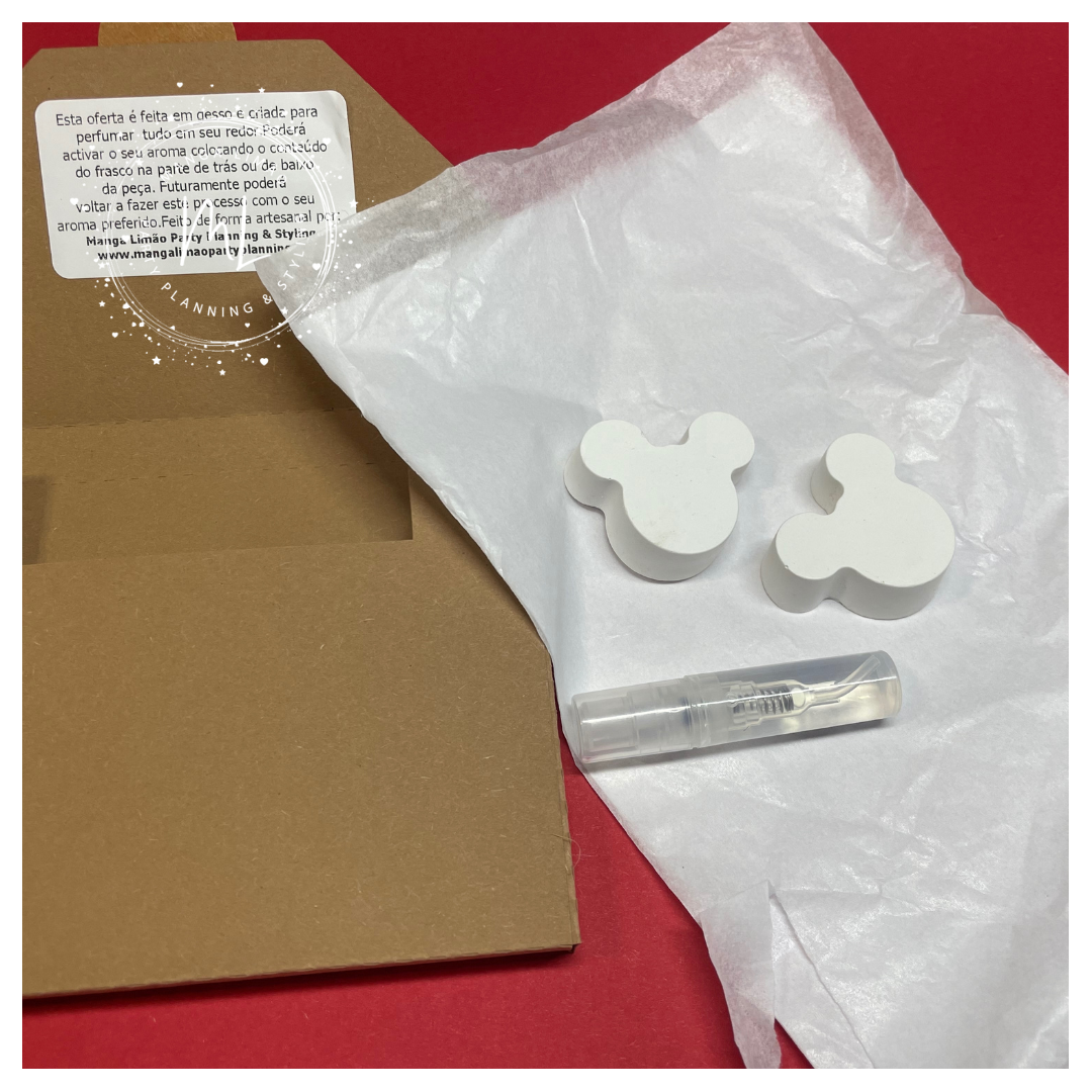 Esta embalagem tráz 2 cabeças de Mickey com cerca de 3 x 3 cm e um frasco com o aroma para poder activar os seus ambientadores quando pretender