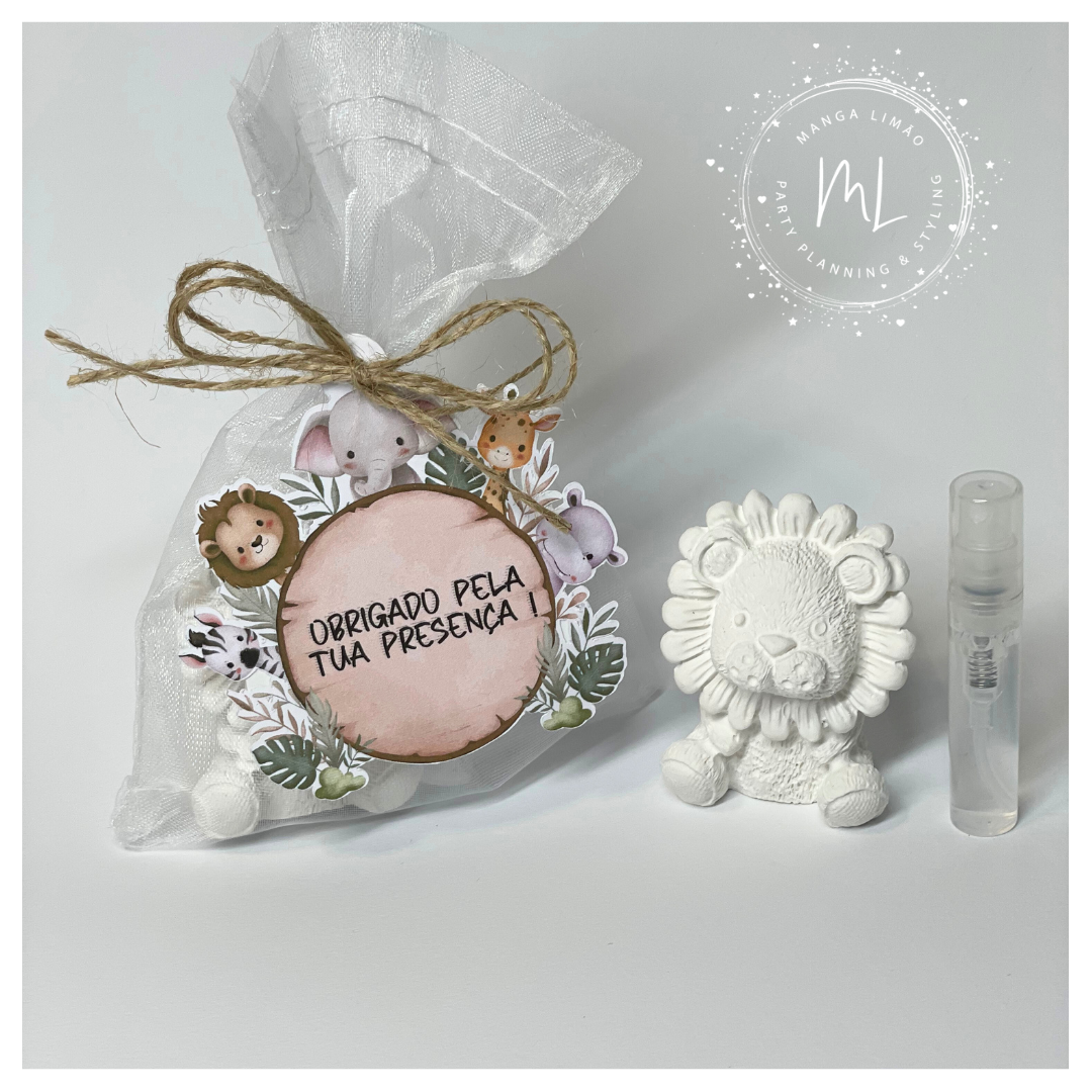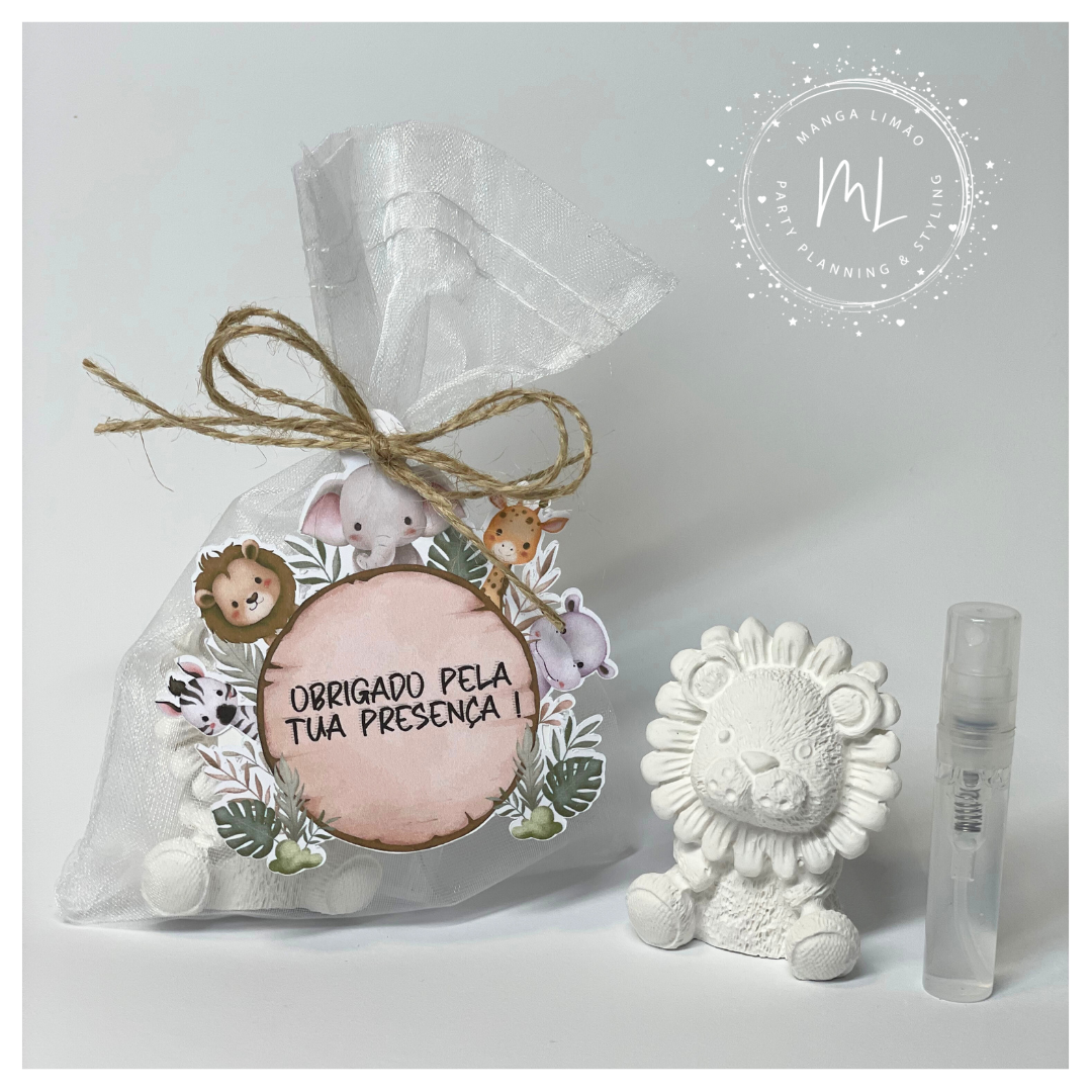 Este pequeno leão em gesso perfumado, medindo cerca de 7 cm de altura , é feito de forma artesanal com atenção aos mínimos detalhes. Cada peça é única e vem cuidadosamente embalada num delicado saco de organza , acompanhada de um pequeno frasco com o aroma e instruções e de uma etiqueta que agradece a presença dos seus convidados.