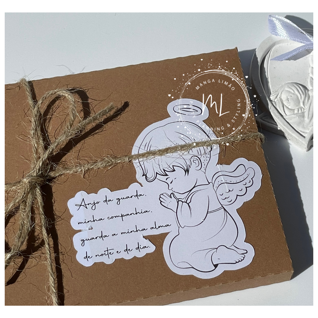 Esta medalha vem numa embalagem com a Oração da Criança ( ''Anjo da Guarda, minha companhia, guarda da minha alma, de noite e de dia'' ), ideal para lembranças de Batismo, primeira comunhão ou outros eventos.