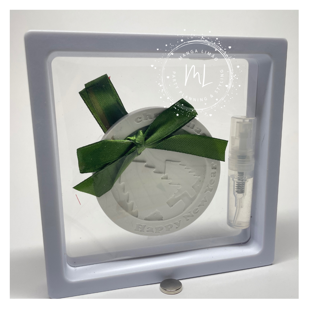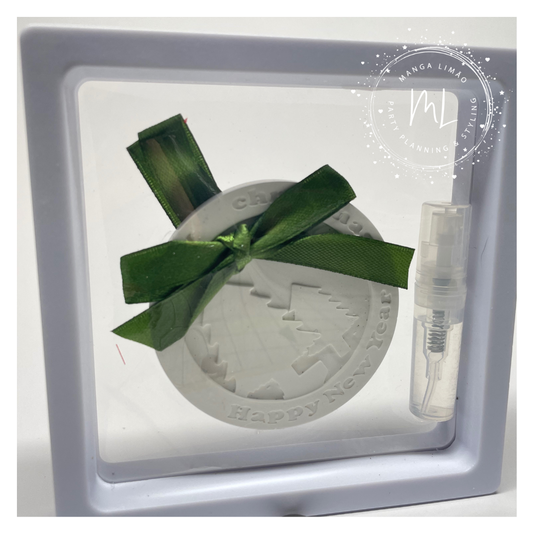 Encante neste Natal com a nossa medalha em gesso perfumado, com aproximadamente 6 cm de diâmetro, delicadamente moldada com a mensagem “Merry Christmas / Happy New Year”. Cada peça vem numa embalagem transparente original, acompanhada de uma elegante moldura em papel verde e um laço azul natalício, criando uma apresentação sofisticada e festiva.