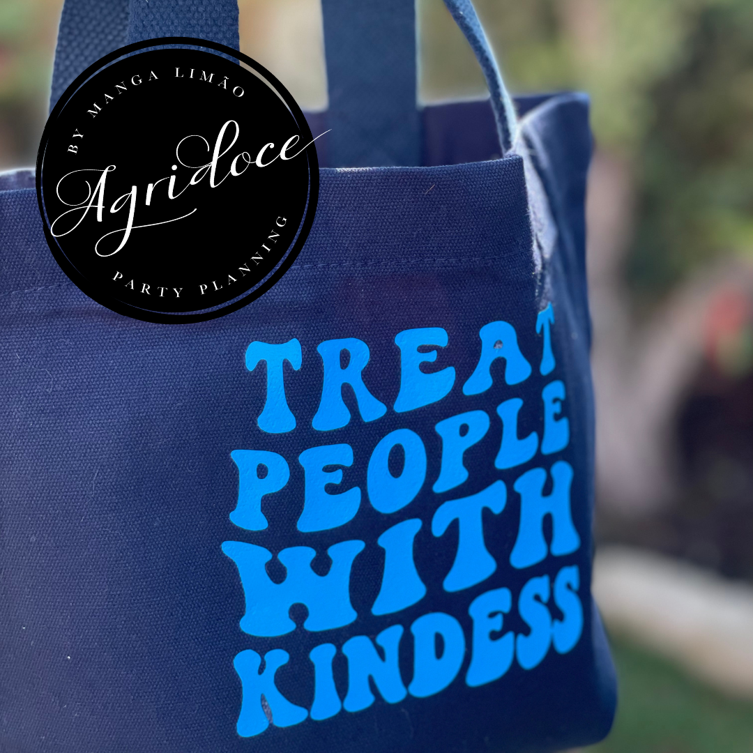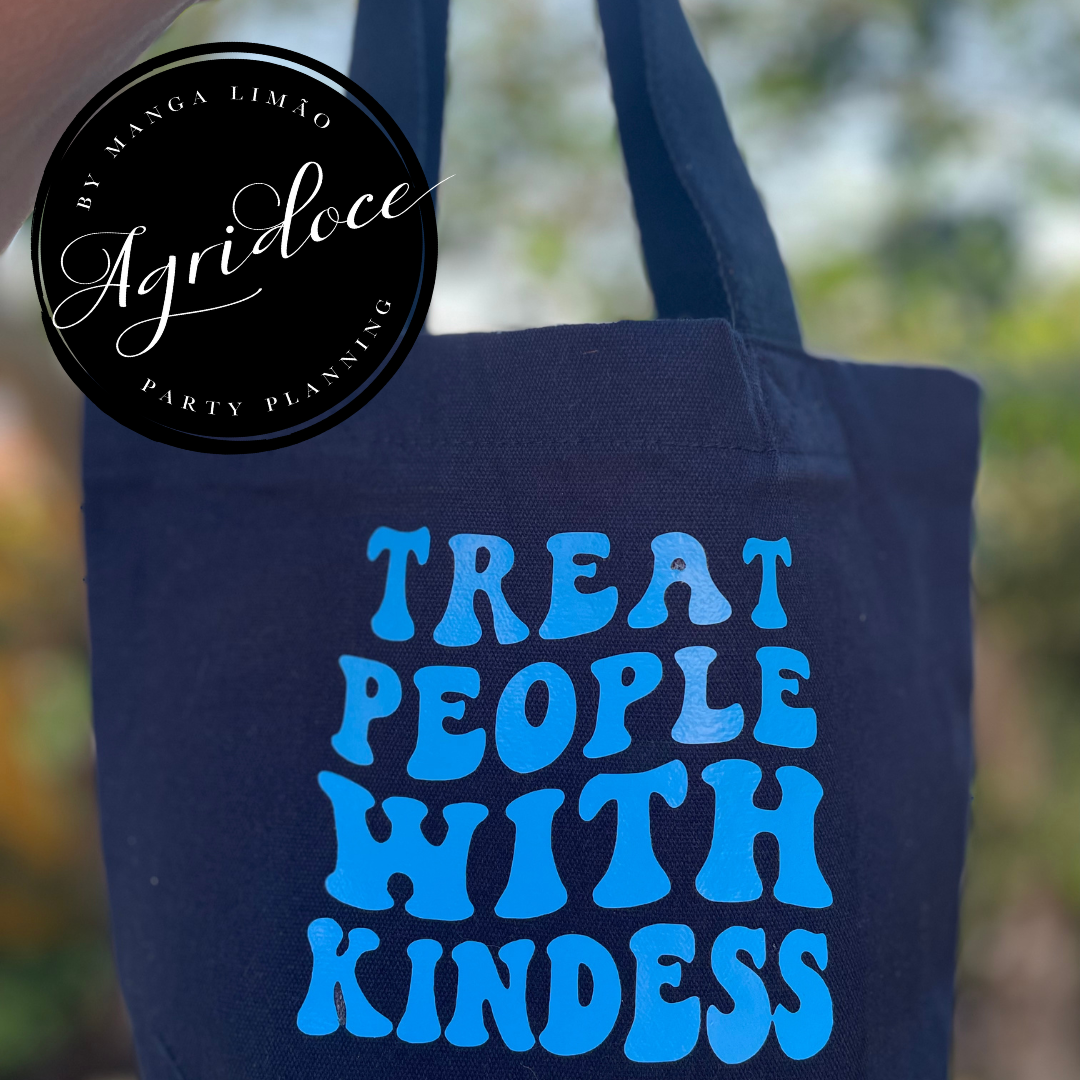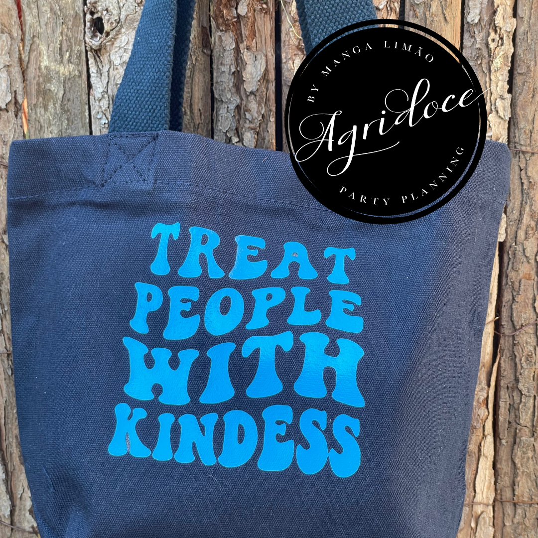 Mini Tote Bag Premium com a frase 'treat People with kindness'. Um saco com cerca de 27x20 cm e um fole na base de 10 cm em algodão orgânico.