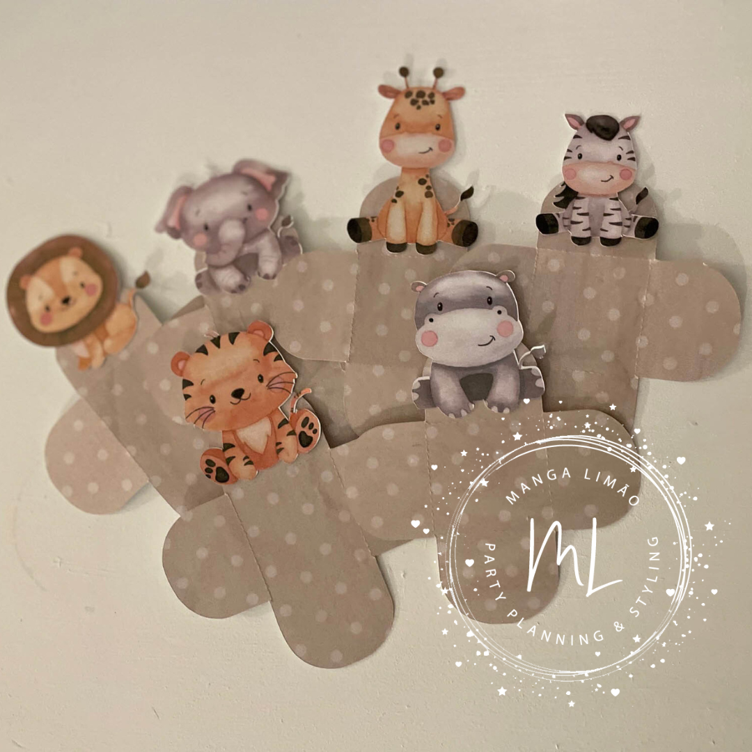 Formas brigadeiro com padrão de pintas beje com animals da selva. Este artigo é enviado em packs de 12 unidades, com 6 animais diferentes. O Leão, tigre, hipopotamo, girafa, zebra e elefante.