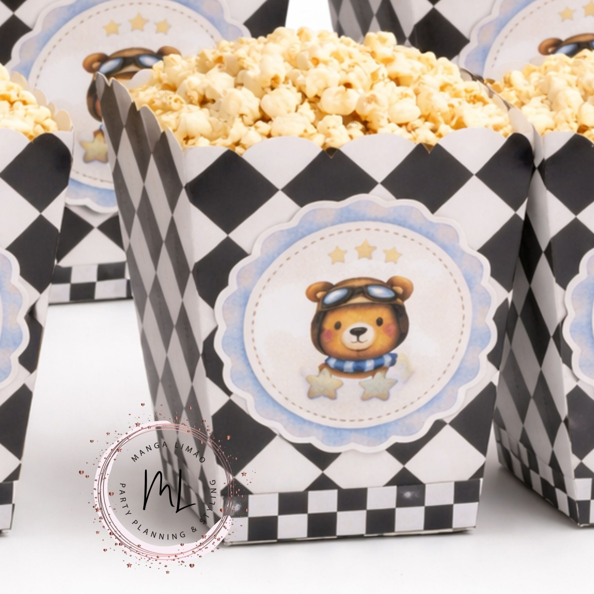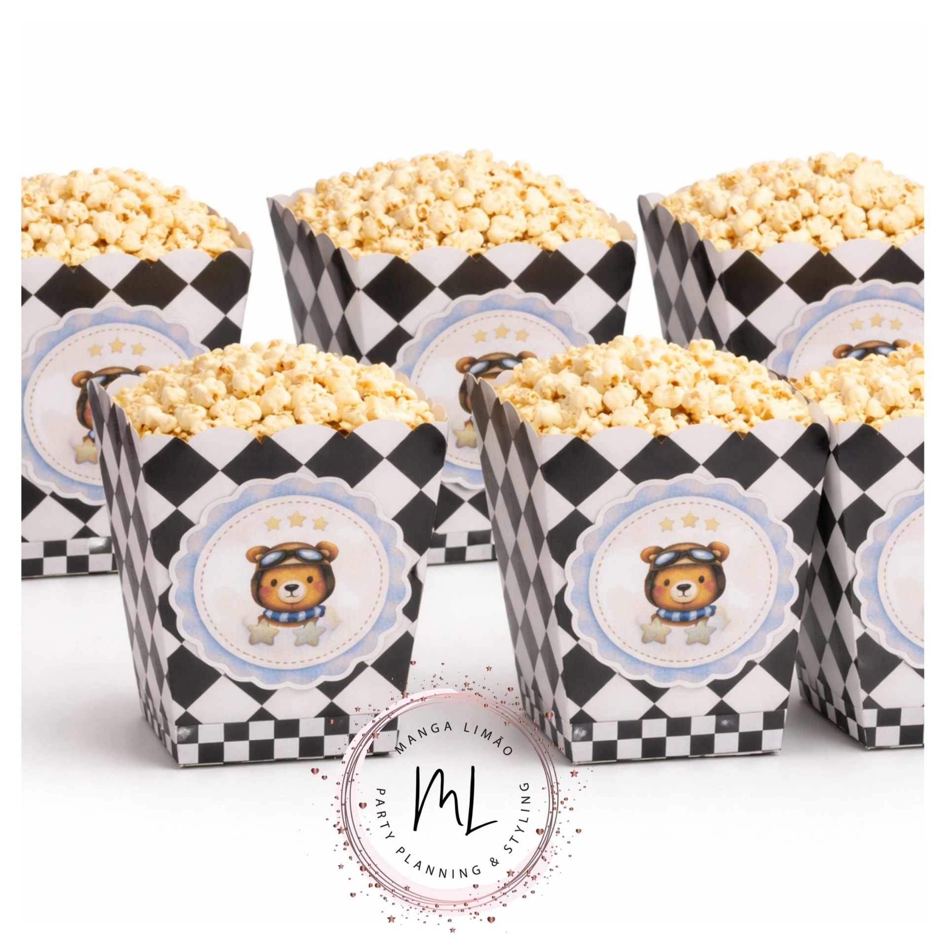 Dá um toque especial à decoração da tua festa com este pack de 6 caixas de pipocas Urso Oliver, perfeito para aniversários infantis com tema ursinho e corrida.
