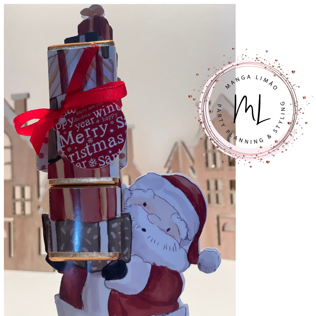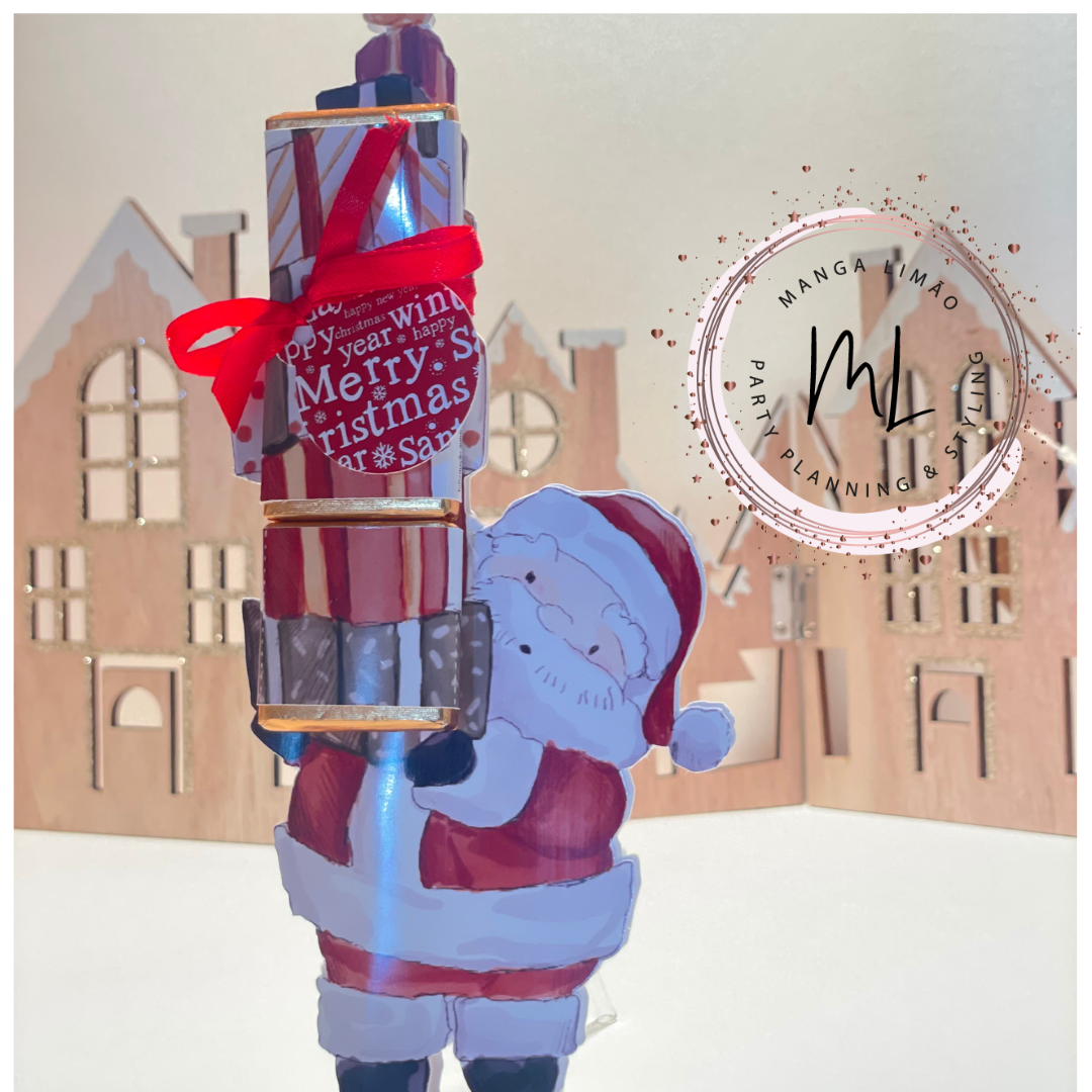 Pai natal com 3 napolitanas de chocolate. Para pequenas lembreanças de de Natal, doces e irresistiveis.