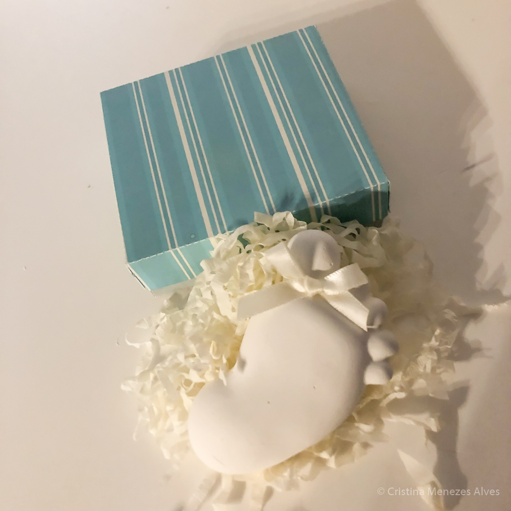 Cada Peça mede cerca de 8.5 x 5 cm e vem numa caixa ás riscas azul ou rosa com cerca de 9.5 x 8.5 cm. A caixa pode ser personalizada com uma frase.