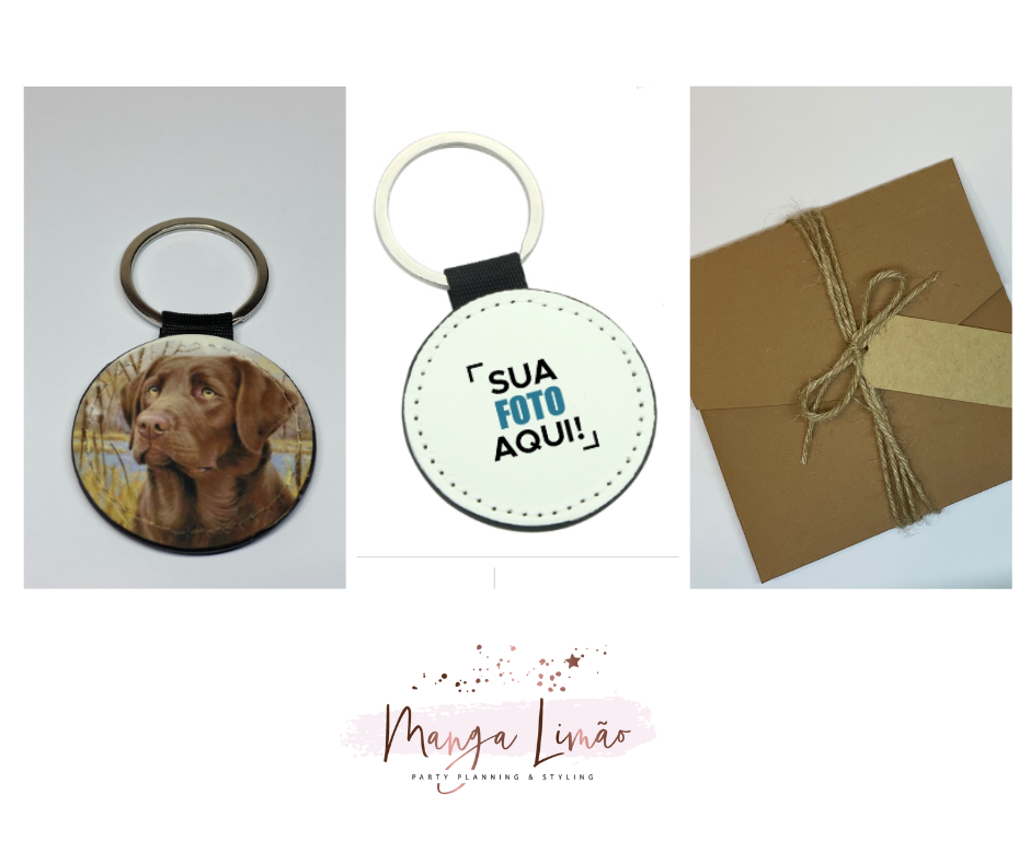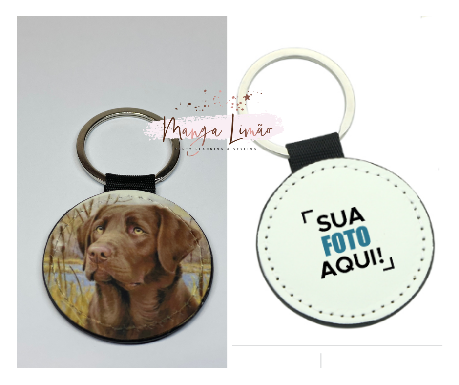 Porta chaves em pele com imagem em ambos os lados. Pode optar por personalizar um dos lados do porta chaves com uma mensagem ou imagem.