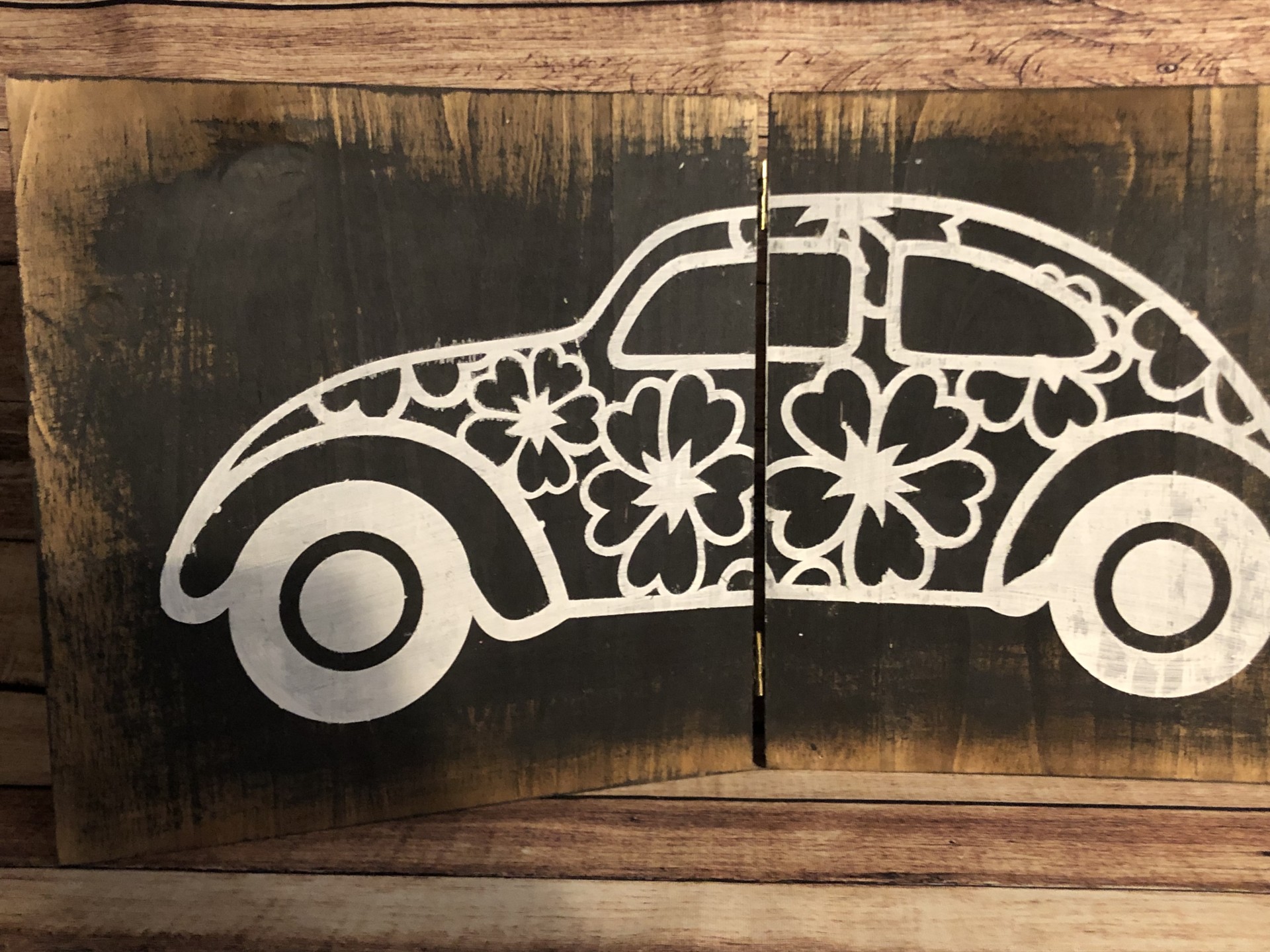 Quadro em madeira pintado a imitar antigo, composto por 2 partes que unem entre si atravéz de dobradiças.