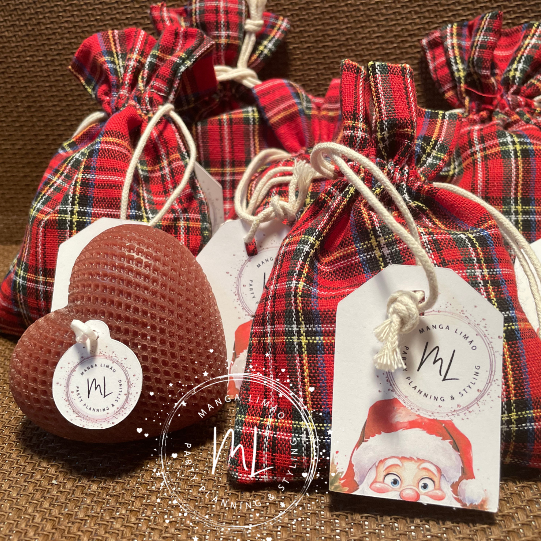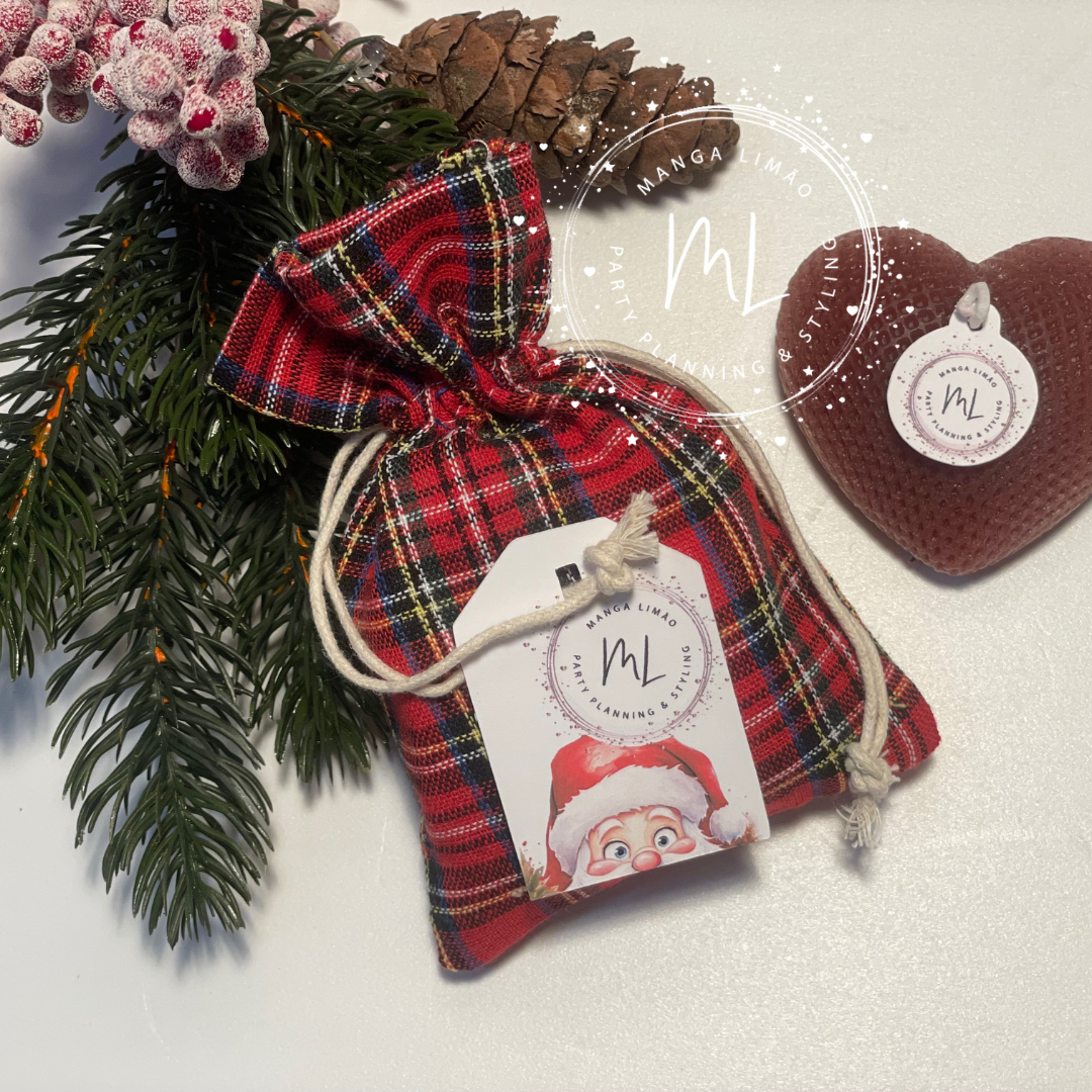 Surpreenda neste Natal com esta delicada lembrança! Um charmoso saco de algodão com padrão em xadrez (dimensões: 15x10 cm) que inclui uma vela em forma de coração (dimensão: 7 cm), perfeita para criar um ambiente acolhedor. A vela possui um delicioso aroma a canela, ideal para aquecer os dias festivos.