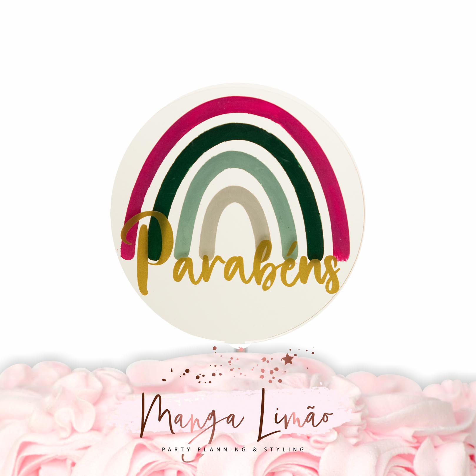 Topo de bolo em acrilico com pintura, apliação de vinil. Arco iris pintado á mão em tons de rosa e verde.