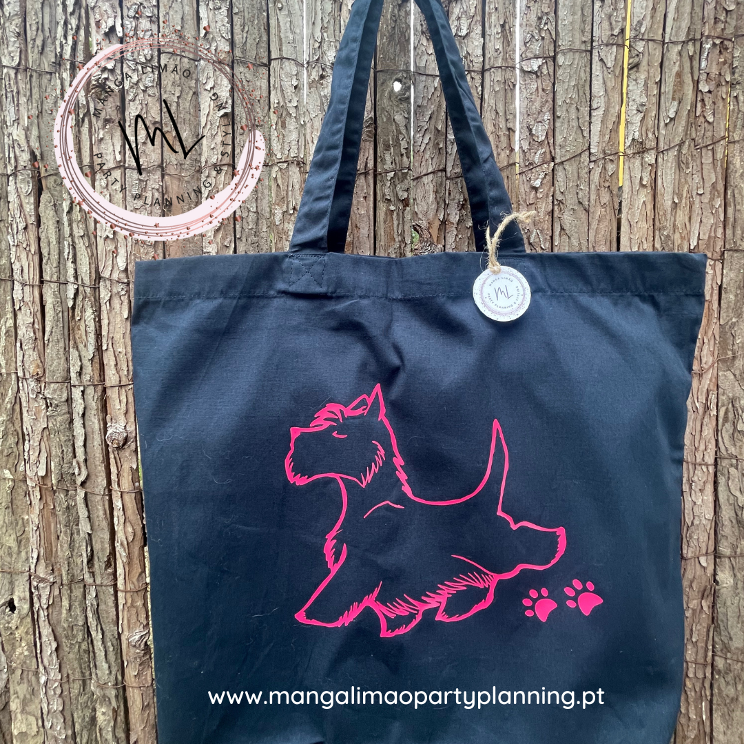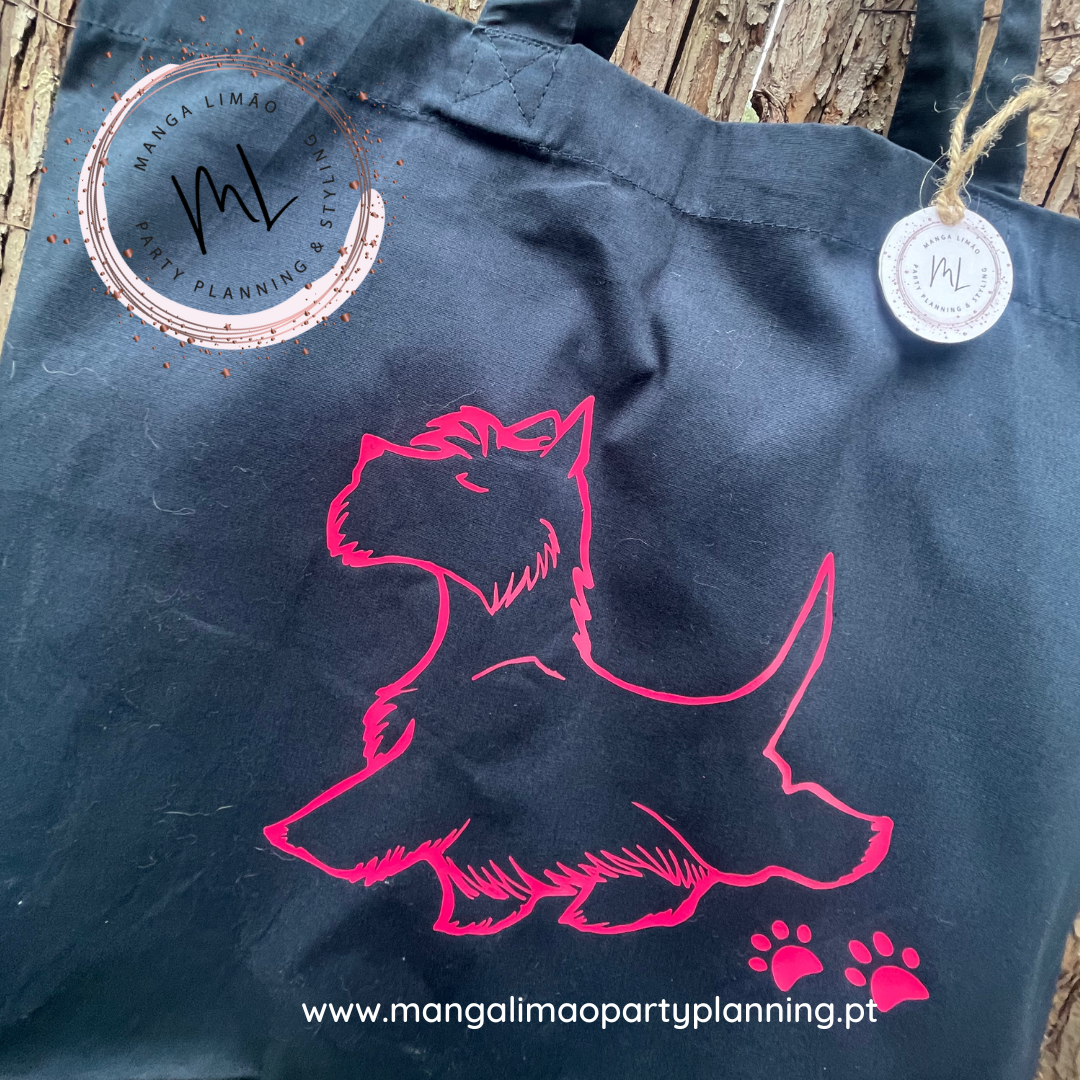 Saco de pano com aplicação de Scotish Terrier em vinil termocolante cor de rosa.